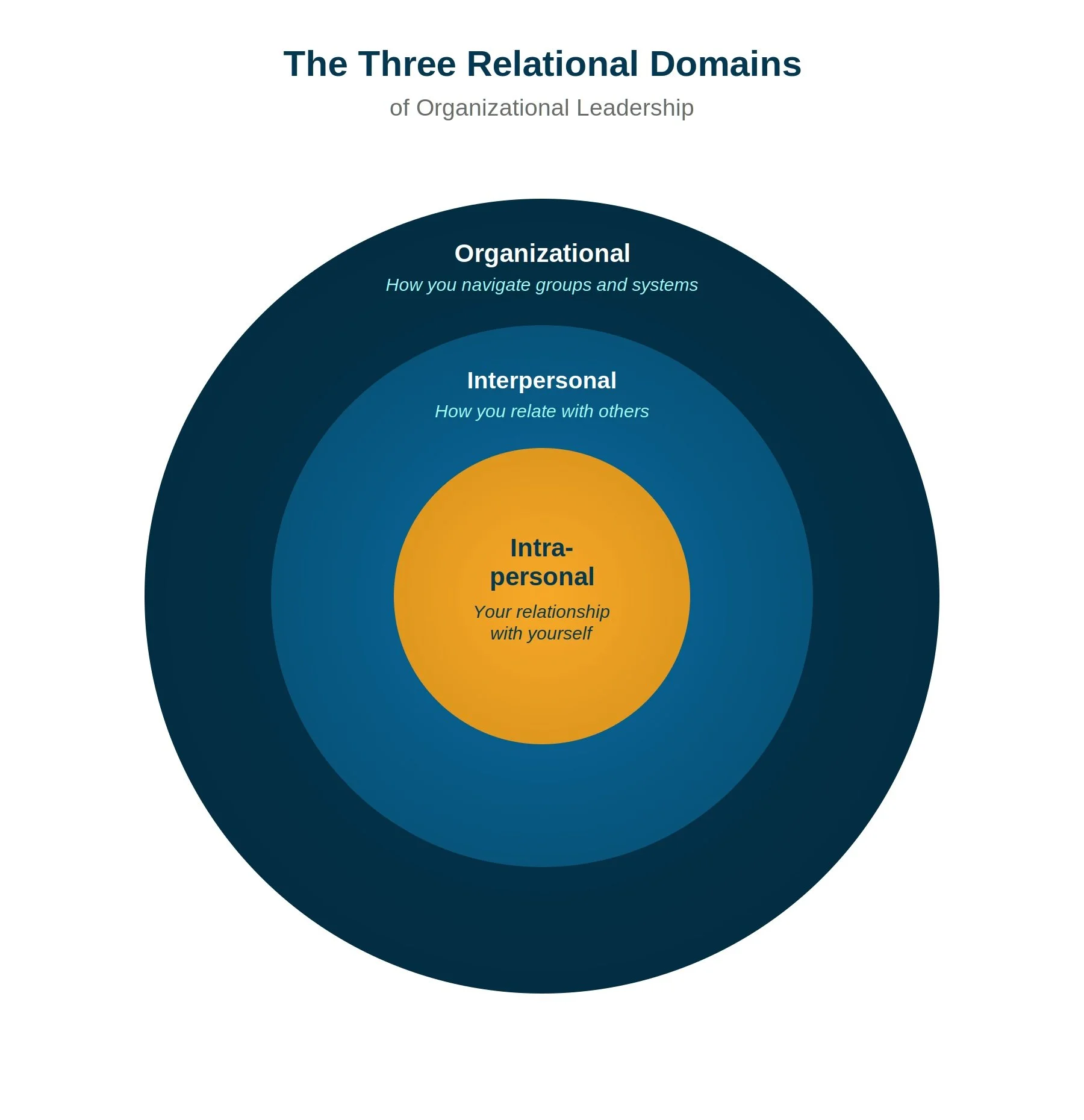 Leaders often get stuck over-focusing on one domain — usually the one that feels most familiar — while the real work of their role is happening somewhere else. This model maps the three relational arenas every organizational leader must navigate: intrapersonal (how we manage ourselves), interpersonal (how we work one-on-one), and organizational (how we operate in groups and systems). It helps leaders spot where they're over- or under-investing, understand the full relational demands of their role, and shift their attention to where it will make the biggest difference.